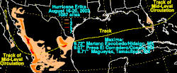 ![]() Vista de satélite del huracán Erika tocó tierra en México el 16 de agosto de 2003 como un huracán categoría 1 en la escala de huracanes de Saffir-Simpson (EHSS) | ||