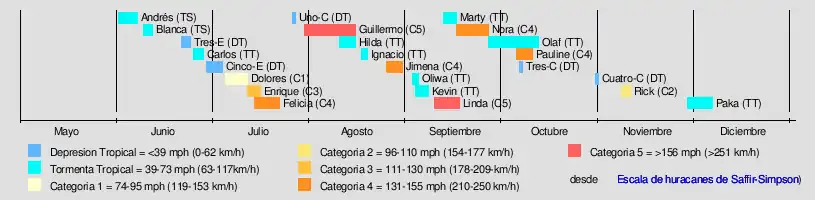 Varias tormentas afectaron la tierra. La primera fue la tormenta tropical Andrés en el que murieron cuatro personas y dejó a otras dos desaparecidas. En agosto, la tormenta tropical Ignacio tomó una ruta inusual, y sus restos extratropicales causó daños menores en el noroeste del Pacífico y California. Linda se convirtió en el huracán más intenso al este del Pacífico en la historia registrada. Aunque nunca llegó a tierra, que produce grandes olas en el sur de California y como resultado cinco personas tuvieron que ser rescatados. El huracán Nora causó inundaciones y daños en el suroeste de los Estados Unidos, mientras que Olaf hizo dos impactos en tierra y causó dieciocho muertes y varias otras personas están desaparecidos. Huracán Paulina mató a varios cientos de personas y causó daños récord en el sureste de México. Además, super tifones Oliva y Paka se originaron en la región antes de cruzar la línea de fecha internacional y causando un daño significativo en el Pacífico occidental. También hubo dos huracanes de categoría 5: Linda y Guillermo.