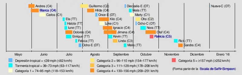La temporada incluyó varias tormentas poderosas y de larga duración, aunque los impactos en la tierra fueron a menudo mínimos. En junio, el huracán Blanca, un huracán de categoría 4 a principios de temporada, mató a cuatro personas debido al mar embravecido. El huracán Carlos causó daños menores a su paso a poca distancia de la costa de México. En julio, los restos del huracán Dolores trajeron precipitaciones récord al sur de California, matando a una persona y causando pérdidas por valor de más de 50 millones de dólares.[nb 3]​ El 29 de agosto, tres huracanes de categoría 4 (Kilo, Ignacio y Jimena) estuvieron activos simultáneamente en el Pacífico al este de la línea internacional de cambio de fecha por primera vez en la historia. En septiembre, la humedad del huracán Linda contribuyó a las tormentas que mataron a 21 personas en Utah. Más tarde ese mes, el huracán Marty causó daños por valor de 30 millones de dólares a la costa suroeste de México. En octubre, el huracán Patricia se convirtió en el huracán más intenso jamás registrado en el hemisferio occidental, con una presión central de 872 mbar (hPa; 25,75 inHg) y vientos sostenidos de 1 minuto de 215 mph (345 km/h). Después de convertirse también en el huracán más fuerte que tocó tierra en el Pacífico registrado en ese momento, Patricia se cobró trece vidas y fue responsable de daños por valor de 463 millones de dólares. La actividad de la temporada continuó hasta noviembre, cuando el huracán Sandra se convirtió en el huracán del Pacífico más fuerte jamás registrado en ese mes. Los daños en toda la cuenca alcanzaron los 566 millones de dólares, mientras que las distintas tormentas mataron a 45 personas.