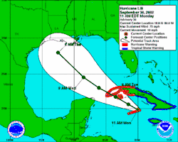 ![]() El huracán Lili cerca de la Península de Yucatán en su máxima intensidad como un huracán mayor de categoría 4 en la escala de huracanes de Saffir-Simpson (EHSS) el 2 de octubre de 2002 | ||