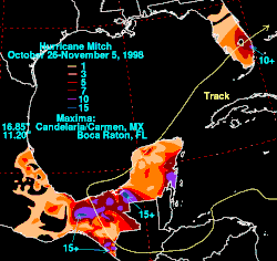 ![]() Huracán Mitch cerca de su máxima intensidad. | ||