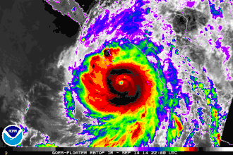 ![]() El huracán Odile poco después de su rápida intensificación el 14 de septiembre de 2014, con la depresión tropical Dieciséis-E en el suroeste | ||