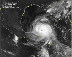 ![]() Vista de imagen del satélite, el huracán Roxana poco antes de tocar tierra en la península de Yucatán, en su máxima intensidad como un huracán mayor de categoría 5 de la escala de huracanes de Saffir-Simpson (EHSS), el 10 de octubre de 1995 | ||