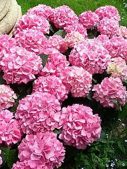 Sus flores pueden ser rosas, blancas, o azules, dependiendo en parte del pH del suelo.[2] En suelos relativamente ácidos, con pH entre 4,5 y 5, las flores se hacen azules; en suelos más alcalinos, con pH entre 6 y 6,5, las flores adquieren un color rosa; y en suelos alcalinos con pH alrededor de 8, las flores crecen blancas.[4]