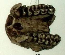 La fórmula dental es ,[6] la misma de los homínidos y otros primates. Los molares son relativamente simples, con cúspides bajas y redondeadas.[7] Sus dientes son muy similares a los de los grandes simios.[6] Existe escaso dimorfismo sexual en el tamaño de los caninos; estos son largos y, tanto los superiores como los inferiores, tiene forma de daga y se proyectan anteriormente. El primer premolar inferior se encuentra ligeramente alargado en dirección mediolingual e interactúa con el borde posterior del canino superior, configurando un dispositivo de corte similar al de los cercopitécidos, el cual se compone de tres piezas: el canino superior, el inferior y el premolar inferior.[29]