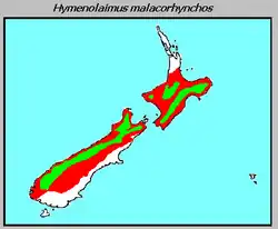 - ↑ BirdLife International (2016). «Hymenolaimus malacorhynchos». Lista Roja de la UICN (IUCN) 2016: e.T22680121A92844858. Consultado el 4 de abril de 2017.
