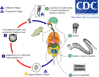 - ↑ CDC H. diminuta life cycle. Accessed online April 2009 at: http://www.dpd.cdc.gov/DPDx/HTML/ImageLibrary/G-L/Hymenolepiasis/body_Hymenolepiasis_il8.htm Archivado el 12 de junio de 2011 en Wayback Machine.