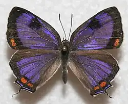 La parte superior de las alas es de color púrpura oscuro con un amplio borde negro u oscuro. Cada ala tiene manchas de color naranja en el borde inferior externo, y cada ala posterior tiene una cola delgada como un pelo. La parte inferior de las alas es de gris pálido a oscuro con manchas blancas y oscuras, con un parche de color naranja en el margen de cada ala delantera, y una mancha naranja con un centro negro en las alas posteriores cerca de la cola. Tiene una envergadura de 3.1 - 3.8 cm.