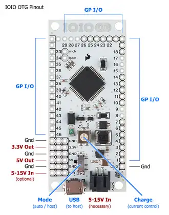 Las tarjetas IOIO de segunda generación (conocidas como IOIO-OTG ) contienen las siguientes características integradas:[33][34][35] Como su nombre indica, una característica clave de esta generación es la introducción de USB-OTG, que admite Modo maestro o esclavo USB. Esto permite que IOIO se conecte a teléfonos Android más antiguos que solo admiten el modo esclavo USB, además.[7][8]
