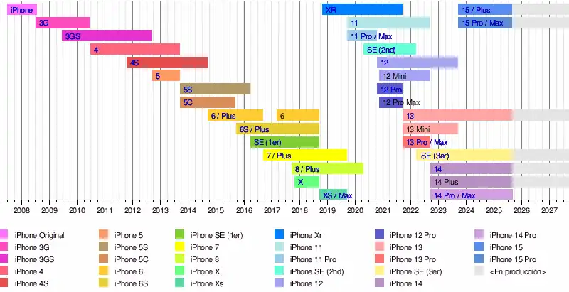 3G: 31 de julio de 2008 3GS: 19 de junio de 2009 4: 24 de junio de 2010 4s: 14 de octubre de 2011 5: 26 de septiembre de 2012 5c, 5s: 20 de septiembre de 2013 6 / 6 Plus: 19 de septiembre de 2014 6s / 6s Plus: 9 de septiembre de 2015 SE: 21 de marzo de 2016 7 / 7 Plus: 16 de septiembre de 2016 8 / 8 Plus: 22 de septiembre de 2017 X: 3 de noviembre de 2017 Xs / Xs Max: 21 de septiembre de 2018 XR: 26 de octubre de 2018 11 / 11 Pro / 11 Pro Max: 20 de septiembre de 2019 SE 2ª gen: 24 de abril de 2020 12 / 12 Mini / 12 Pro / 12 Pro Max: 16 de octubre de 2020 13 / 13 Mini / 13 Pro / 13 Pro Max: 14 de septiembre de 2021 14 / 14 Plus / 14 Pro / 14 Pro Max: 9 de septiembre de 2022 16e: 28 de febrero de 2025 16 / 16 Plus / 16 Pro / 16 Pro Max: 20 de septiembre de 2024 | |