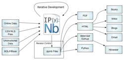 El cuaderno Notebook de IPython está basado en la web y es interactivo. Un notebook en IPython es un documento JSON que contiene una lista ordenada de entradas / salidas las cuales pueden tener código, texto, matemáticas, dibujos y rich media. Los notebooks de IPython pueden ser convertidos a otros formatos de archivos como HTML, presentaciones de diapositivas, LaTeX, PDF, Python, etc).