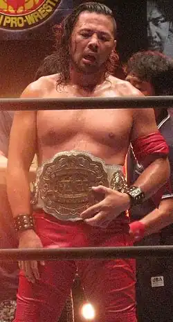![]() El excampeón Hiroshi Tanahashi en 2017, con el último diseño del campeonato. | |||||||||||||||||