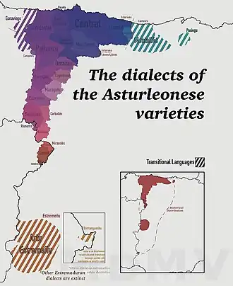 El asturiano (autoglotónimo: asturianu), también denominado bable,[6]​ es el glotónimo que la lengua asturleonesa recibe en el Principado de Asturias, lengua que tiene continuidad con las hablas tradicionales de la región de León en León y Zamora (donde se denomina leonés), y Miranda de Duero en Portugal (llamado mirandés), donde es oficial en virtud de la Ley n.º 7/99, de 29 de enero de 1999 de la República Portuguesa. Los muy diversos dialectos del asturiano se clasifican usualmente en tres grandes áreas geográficas: occidental, central y oriental; las tres áreas tienen continuidad con los dialectos leoneses por el sur. En el caso asturiano, por razones históricas y demográficas el estándar lingüístico está basado en el asturleonés central. El asturiano cuenta con una gramática, un diccionario de la lengua asturiana (el Diccionariu de la Llingua Asturiana) y unas normas ortográficas.[7]​ Está regulado por la Academia de la Lengua Asturiana y, aunque no goza de carácter oficial en el Estatuto de Autonomía, una ley regula su uso en Asturias.[8]