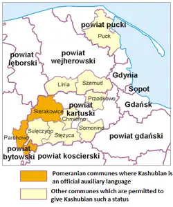A partir de 2005, cinco municipios (gminas) en el voivodato de Pomerania han cooficializado el casubio junto al polaco como lengua auxiliar, convirtiéndose en comunas bilingües.