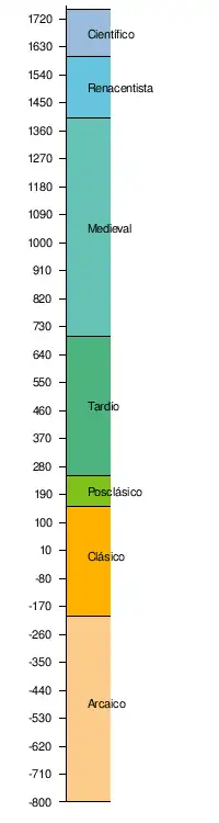 - Arcaico: desde que nace hasta que la sociedad romana entra en la órbita cultural de Grecia (helenización): siglo VIII a. C.-siglo II a. C. Autores destacados de este período son Apio Claudio el Ciego, Livio Andrónico, Nevio, Ennio, Plauto, Terencio.