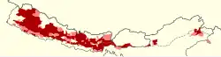 Mapa superior: difusión del idioma nepalí en el sur de Asia; Rojo oscuro: Mayoritario. Rosa: Minorías
