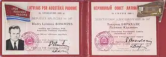 Una tarjeta de identidad bilingüe (en letón y ruso) de 1980 del diputado del pueblo del Consejo Supremo de la RSS de Letonia.