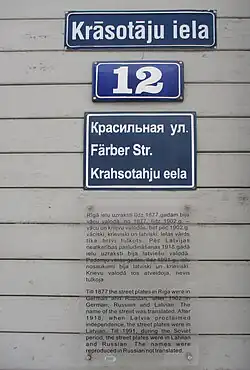 Placas de calle monolingües modernas para las calles Krāsotāji y Mūrnieki en Riga y placas trilingües decorativas con los nombres históricos, ruso incluido (Красильная улица and Мурничная улица), que se usaron entre 1877 y 1918.
