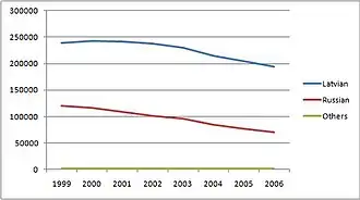 Número de alumnos por lengua de enseñanza en las escuelas letonas de 1999 a 2006 (azul: letón; rojo: ruso; verde: otras lenguas).