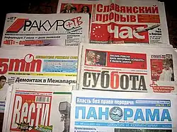 Un surtido de periódicos en ruso publicados en Letonia en 2007: RakursTV, Chas, 5 min, Subbota, Vesti y Panorama (de izquierda a derecha, empezando por la parte superior).
