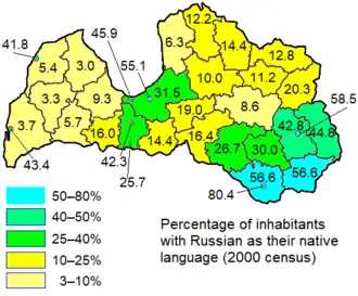 En 2000, el 37,5 % de los habitantes hablaban ruso como lengua materna y el 43,7 % como segunda lengua. Entre ellos, el 73 % de los bielorrusos, el 68 % de los ucranianos, el 58 % de los polacos y el 79 % de los judíos declararon que tenían el ruso como lengua materna.[20]​ En el censo de 2011, el 37,2 % declaró que el ruso era la lengua que más hablaban en casa. En la región de Latgalia, el 60,3 % de la población hablaba ruso en casa, pero el condado de Zilupe era el que tenía el mayor porcentaje de rusoparlantes (92,1 %). En la capital, Riga, el 55,8 % de los habitantes hablaban ruso en casa.[1][2]