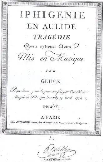 Ifigenia en Áulide se estrenó en la Ópera de París el 19 de abril de 1774, y "al principio no fue popular, aunque su obertura fue aplaudida generosamente desde el principio. Después del estreno se programó el 22, 24 y 29 de abril y se interrumpió del 1 de mayo al 15 de junio de 1774 por el cierre de los teatros por la enfermedad y la muerte de Luis XV ... Ifigenia en Áulide no volvió a la escena hasta el 10 de enero de 1775, pero se repuso anualmente en 1776-1780, 1782-1793, 1796-1824. Se montó en París más de 400 veces en un intervalo de 50 años,[3] y al final resultó ser la ópera de Gluck más representada en París.[4] Para la reposición de 1775, "Gluck revisó Ifigenia en Áulide ... introduciendo a la diosa Diana (soprano) al final de la ópera como una dea ex machina, y alterando y expandiendo los divertissements... Así que, hablando en términos generales, hay dos versiones de la ópera; pero las diferencias no son en modo alguno tan grandes o importantes como las que hay entre Orfeo ed Euridice y Orphée et Euridice o entre la versión italiana y la francesa de Alceste".[5]