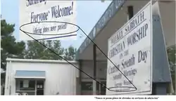 El 16 de febrero de 2010, la orden fue ejecutada por un negocio de anuncios (contratado) y un jefe de policía en la propiedad de Guys,[20][21][22] en medio de las protestas de los simpatizantes que se enteraron.[23][24] El 8 de marzo, los letreros principales (del nombre de la iglesia) fueron repintados por la Iglesia,[25][26] a lo cual la Asociación General respondió con una moción para demandar una audiencia por desacato, programada para el 25 de mayo.[27][28] Lucan Chartier, un joven pastor asistente de la congregación de Guys, testificó sobre su participación en el repintado de los anuncios y el mantenimiento de los sitios web de la Iglesia, respondiendo a posteriores interrogatorios que continuaría haciéndolo porque "no tiene más remedio que seguir su conciencia sobre la base de lo que dicta su religión."[29]