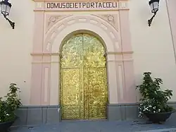 Magnífica puerta dorada de la iglesia parroquial de San Juan Bautista de Artana, repujada por dos herreros hermanos de la localidad.