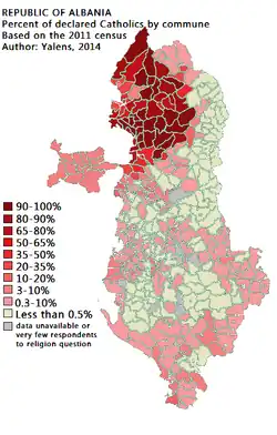 - Esta obra contiene una traducción derivada de «Roman Catholicism in Albania» de Wikipedia en inglés, publicada por sus editores bajo la Licencia de documentación libre de GNU y la Licencia Creative Commons Atribución-CompartirIgual 4.0 Internacional.