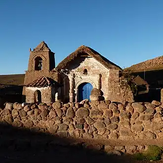 El monumento corresponde a la iglesia principal, la iglesia antigua, dos templetes o calvarios, y un cerco de piedra que delimita el área. La iglesia principal está compuesta por una sola nave, el campanil y una pequeña habitación anexada a la nave que sirve de bodega. Está orientada de oriente a poniente, según las costumbres aimaras. Posee una base rectangular simétrica, sobre la que se levantan gruesos muros de mampostería de piedra. La solidez del muro es reforzada por los contrafuertes —también de mampostería— y por el campanil, que actúa como soporte del muro lateral sur.[1][2]