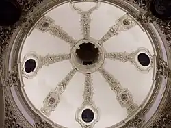 - Escudos heráldicos iguales, pintados al fresco en las pechinas de la cúpula y rodeados de molduras y adornos de yeso, corresponden a los Arias y Acebedo, patronos de la iglesia. Atributos: olivo, caballo, vasijas y pozo. Datan del siglo XVII.