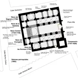En un principio el templo constaba de tres naves, la actual nave central y las naves de Las Ánimas y del Sagrario siendo la central de doble tamaño que las lateraes y carecía de campanario. A esta construcción se le añadieron dos naves más en sus extremos, de menor altura que las preexistentes denominadas de la Epístola en 1790, obra del maestro mayor de Fortificaciones Isidro Casaus, y del Evangelio en 1793, obra del maestro alarife Alonso Barranco el Menor. Para comunicar las nuevas naves con el interior del templo se abrieron arcos de medio punto en la por entonces fachada exterior situando junto a estos el via crucis.