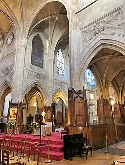 Ernest Lami de Nozan realizó en 1846-1847 ocho vidrieras para el coro de la iglesia, a partir de cartones de Auguste Galimard. Se citan en L'Illustration, en 1847.[12] Tres de esas ventanas aún son visibles.[13] Las otras vidrieras fueron reemplazadas en 1939 por vidrieras diseñadas por el pintor polaco Elesckiewiej y convertidas en vidrieras en el estudio parisino de Jean Gaudin.
