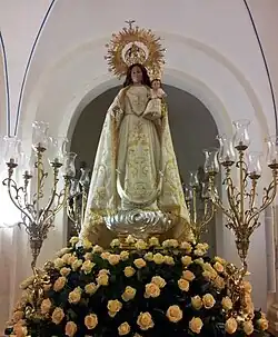 Se encuentra en la capilla del Rosario. Esta capilla tiene planta de cruz griega y el camarín donde se encuentra la imagen es octogonal con yeserías ornamentadas en color dorado y retablo diseñado por David Torres del Alcázar. En las pechinas del crucero hay cuatro cuadros de Jorge García Aznar con escenas del Rosario. En su cripta subterránea eran enterrados los personajes más influyentes de épocas pasadas en la Villa como la Marquesa de Camachos.