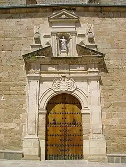 La portada principal, de estilo clasicista, se abre en la fachada sur, sobre un murete de contención y dominando una placeta en la vertiente más inclinada, siguiendo las pautas trentinas en cuanto a modestia del muro perimetral en arquitectura de gran volumen y escasa ornamentación. La portada consta de arco de medio punto sobre impostas y extradós canjeado donde, a modo de clave, se dibuja un óvalo que inscribe la heráldica episcopal. Enmarcan el vano pilastras toscanas cajeadas sobre basamento, que soportan entablamento de friso compartimentado en estilizados triglifos y metopas con gotas. Sobre estos destaca un resaltado frontón triangular partido, en cuyos extremos se prolongan las pilastras y rematan en pináculo de bolas y, en placas, cruces de San Andrés. El frontón alberga una hornacina avenerada donde se ubica una escultura del santo titular sosteniendo en su diestra la cruz correspondiente.
