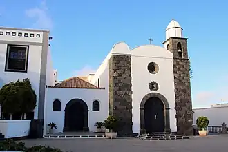 El campanario surge como continuación de todo el esquinero de cantería de la epístola, rematada con un pequeño cimborrio y el remate de la Iglesia con formas ovaladas y totalmente encaladas. Al igual que la iglesia de Yaiza, se puede acceder por el muro de la epístola. Responde a la tipología insular más extendida.
