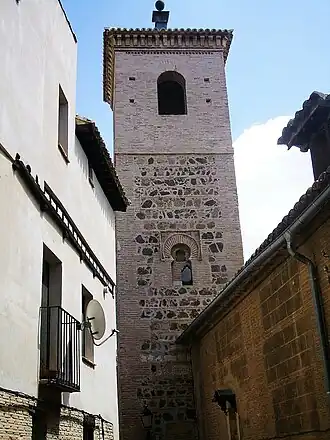 La parte más antigua de la iglesia es la torre, ahora englobada en la nave del Evangelio, pero que en su origen fue una construcción exenta. Su condición de medieval fue descubierta en 1940, durante una campaña de restauración en la que se retiró el revestimiento que la cubría. Deriva directamente del alminar musulmán, como la de Santiago del Arrabal, con la que presenta evidentes semejanzas, tanto en la estructura interior —lanta con machón macizo central y uso de bovedillas escalonadas de ladrillos en saledizo— como en el exterior —aparejo de mampostería encintada, en cajas muy estrechas—, y sobre todo por la presencia de una ventana, con doble arco de herradura y alfiz, idéntica a la de Santiago del Arrabal. Podría fecharse en la primera mitad del siglo XIII; si bien, algunos autores, le confieren mayor antigüedad.