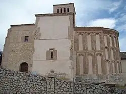 Al exterior, la cabecera se ordena según los modelos cuellaranos, con dos pisos de arcos ciegos en su tramo recto y tres en el semicírculo. Los del tramo recto se separan mediante alfices e impostas a sardinel, mientras que los de ábside ascienden sin interrupción hasta el friso de esquinillas que les remata. Toda la cabecera descansa sobre un zócalo de mampostería a espejo, que a su vez lo hace sobre una fuerte cimentación de calicanto.