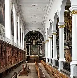 - En todo su ancho, el coro está separado de la nave central por un notable banco de comunión de madera (siglo XVIII), trabajado con motivos que recuerdan al pan eucarístico de la comunión. A ambos lados del ábside central están los absidiolos con altares laterales dedicados, uno al apóstol de las Indias, San Francisco Javier (a la izquierda) y el otro a la Virgen María (a la derecha).