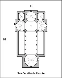 Iglesia de planta basilical de tres naves, separadas por una arquería de herradura, compuesta por cinco columnas.[15] y otra arquería a modo de crucero, presentando mayor altura la nave central, que se ilumina por ventanas en los muros sobre las naves laterales. La cabecera está formada por tres ábsides cuadrangulares con forma de herradura inscrita, y un cuerpo a modo de nártex al pie de la nave central (se trata de una cabecera recta y tripartita)[18][15] Las capillas laterales al ábside son cuadradas y no se comunican.[15] Los brazos del transepto acaban en sendas exedras.[4][19][20] EL transepto se diferencia del crucero por pilares cuadrados a los que se adosan las columnas. Sus brazos terminan en herradura al interior y son rectos al exterior. Para estas, se emplea sillería en las esquinas y mampostería caliza. Las columnas son reutilizados.[15]