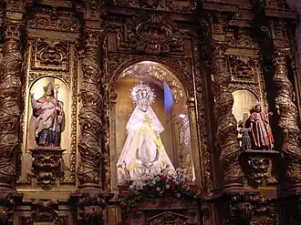 El retablo mayor es barroco de finales del siglo XVII de la escuela vallisoletana. En el centro se venera la Virgen del Socorro en hornacina-camarín. Las dos calles laterales están separadas por columnas salomónicas que también aparecen en el cuerpo superior o ático.