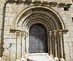 La fachada sur presenta una cornisa sostenida por ménsulas esculpidas con diferentes rostros humanoides. La puerta está compuesta por cuatro arquivoltas en degradación de base rectangular y tres pares de columnas, todas con capiteles profusamente labrados con representaciones zoomórficas y decoraciones vegetales formando dibujos geométricos. El arco frontal primero, tiene una cenefa ajedrezada y un grueso bordón con bolas en su arista, en otro arco la decoración fue efectuada con la imitación de una cinta enrollada. En el capitel central de la izquierda está repetido el mismo adorno que se encuentra en un capitel de la Iglesia de Santa María de Cap d'Arán de Tredós.