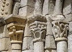El ábside construido en la parte este, está ornamentado con un friso de dientes de sierra y cornisa sostenida por ménsulas intercaladas entre medias columnas con capiteles adosadas (lesenas) desde la base del ábside hasta el friso. La ventana centrada realizada con dovelas decoradas con medias bolas, tiene una arquivolta con representaciones geométricas y de rostros humanos.