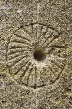 En la unión de las fachadas meridional y occidental, se encuentran UNA TALLA y un disco solar que algunos identifican como un reloj solar debido posiblemente a sus 24 divisiones, aunque su posición próxima al basamento y orientación son inhabituales para un reloj de sol.