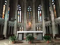 En el altar mayor había un retablo neogótico que posteriormente fue trasladado a la capilla del Santísimo y, finalmente, retirado. Se conservan en la sacristía dos plafones con seis ángeles, obra de Ricard Marlet de 1955, de estilo novecentista.[4]​ Las dos columnas que flanquean el presbiterio están decoradas con pinturas y esculturas de Joaquim Busquets (1998-1999).[5]