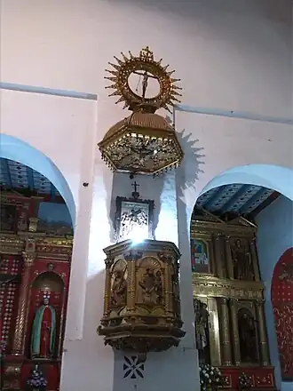 Hacia el interior la iglesia gira entre una austeridad franciscana y la estética de la restauración de 1992 con la conmemoración del V Centenario del Descubrimiento de América, donde destacan los grupos escultóricos del retablo mayor de San Francisco, de tres cuerpos y cinco calles con predela, el arco toral hojillado en oro y sobre grandes pilastras y capiteles corintios, el púlpito sobre el lado del Evangelio, el grupo escultórico de la Crucifixión, el Altar de los Pelícanos, en madera noble que es una de las mejores muestras iconográficas del simbolismo de la pasión de nuestro Señor y el camarín de la Inmaculada Concepción, con una profusión de decoración pictórica en vivos colores azules, blancos y rojos.
