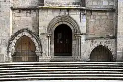 La iglesia tiene planta de cruz latina y ábside pentagonal con bóveda de abanico, en el que se abren cinco ventanas ojivales. El ábside es de los más bellos de la provincia. Al exterior, la portada tiene arcos semicirculares con columnas en las jambas y dos arcos menores encuadrando al principal.[2]