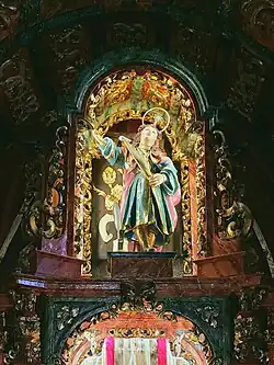 Frente al retablo de la Capilla de San José, detrás del cual se cree pueden permanecer ocultos varios frescos como en el caso de la Capilla de la Purificación,[15] se ubican una imagen de Nuestra Señora del Perpetuo Socorro y una estatua de la Virgen de Fátima, mientras que a la entrada del templo destacan tres tallas de madera las cuales representan a Santa Rosalía de Palermo, San Antonio de Padua y Nuestra Señora de los Dolores, estas dos últimas de vestir, siendo las más veneradas Santa Rosalía, la Virgen del Carmen y San Ginés, las cuales son sacadas en procesión durante sus respectivas festividades al igual que otras tallas, como la de San Roque. En la formación rocosa que constituye la base de la estatua de Santa Rosalía figura la leyenda hallada en una gruta el 25 de agosto de 1624 por dos albañiles que se encontraban trabajabando en el convento dominico de San Esteban de Quisquina: