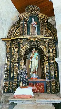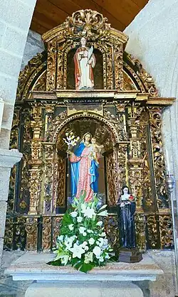 De un cuerpo con tres calles y ático semicircular, presenta policromía granate, verde y dorada, albergando en el centro, bajo un arco de medio punto y sobre el sagrario, una talla de San Ginés de Arlés caracterizada por un rostro imberbe, vestimenta de palio, un cuchillo en el cuello, una palma, una pluma y un tintero.[12] El resto de imágenes que adornan la estructura representan, bajo arcos de medio punto enmarcados por estípites rematados en pequeñas cornisas y todo ello cubierto de motivos vegetales en relieve, a San Juan Bautista a la izquierda y a San Roque a la derecha, hallándose un Cristo crucificado sobre una cruz de madera de chonta (regalo de Don Domingo) flanqueada por cuatro ángeles en el ático del retablo los cuales portan una escalera, una cruz, un cáliz y una lanza. Bajo el altar se conserva así mismo una imagen de Cristo yacente obra de Maximino Magariños Rodríguez custodiada dentro de una urna, regalo del alcalde de Sangenjo Don Ramón Orge Pérez. Todas las tallas del retablo son del siglo XVIII a excepción de la imagen de San Roque, de factura moderna la cual sustituye a una estatua del mismo santo gravemente deteriorada y por ello retirada del culto. El retablo reemplaza a su vez a uno anterior fechado en el siglo xvii e incendiado durante un ataque inglés en 1720. Por su parte, la lámpara votiva suspendida de la clave del arco triunfal constituye una obra de orfebrería de principios del siglo xix cuya autoría corresponde al platero compostelano Francisco Pecoul.[11]