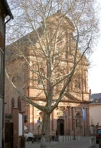 Su fachada fue construida entre 1774-1775, siendo atribuida al arquitecto y estucador electoral Johann Peter Jäger, bajo la influencia de la arquitectura barroca romana.